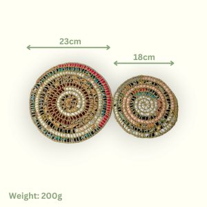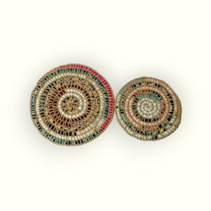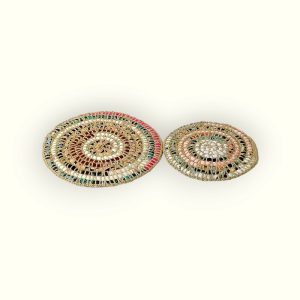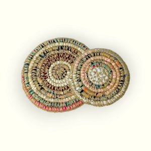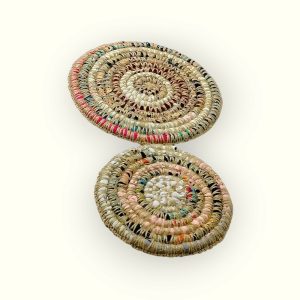 Elevate your dining experience with our handcrafted Pan Coasters, a set of two in small and medium sizes. Each coaster is crocheted from upcycled fabric scraps, making every piece a unique work of art. Created by talented women artisans in Egypt, these coasters bring warmth and a splash of color to your table while showcasing the beauty of sustainable craftsmanship. The carefully chosen fabric remnants, ranging from cotton to mixed fibers, add a blend of textures and hues, making these coasters an ideal decorative and functional piece. Whether protecting your surfaces from hot pans or using them as accent decor, these coasters reflect the spirit of Egyptian artistry.